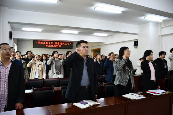 全体教职工在纪委委员张成的带领下,重温教师廉洁从教宣誓誓词。通过庄严宣誓,教师深化廉洁教育进课堂、坚定无私奉献育桃李、廉洁从教铸师魂的决心和信心。为国家培养更多更优秀的社会主义接班人而奋斗不息。