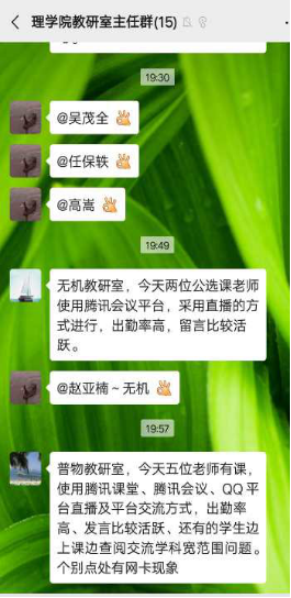 在这一特殊时期,网络成了唯一可以将老师同学们联系到一起的工具,所以为了使网课能够顺利的开展进行,理学院的领导及教师展开了多次网络会议,除了日常的防疫工作外,也在对网络教学的开展进行着部署。经过学院的各位领导的商议,与各位任课教师的协调与沟通,与各位辅导员的交流,以及部分同学的反馈,理学院于二月初制定出《理学院2020年春季学期延迟开学期间教学工作实施方案》,成立了疫情防控期间教学质量监控小组,由阎峰院长和徐平书记担任组长,带领韩世迁副院长、李文泽副院长、杨海霞副书记三位副组长以及各教研室主任等十二位老师共同负责,在确切落实学校“停课不停学”的要求的同时,保证网课的教学进度和教学质量。不仅制定了紧密的计划,更是不停地根据同学们和任课教师的反馈进行调整。