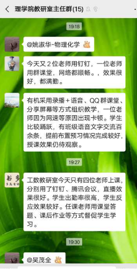 为了了解网课的教学效果,以及任课教师及同学们的切身感受,学院建立了教师网课管理群,来接收教师们对于网络授课的反馈。根据教师们的反馈,我们发现,在网上授课对于老师来说是一个重大的挑战。例如不在切实的教室授课,缺乏实时的约束,再加上身边各种各样的诱惑,学生们不可避免地更容易分神。