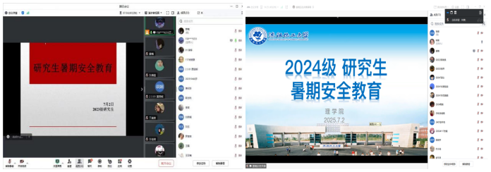 为加强暑假期间学生安全教育力度,确保留校学生校园人身安全,理学院于7月3日,组织2023级和2024级全体研究生召开线上暑期安全教育会。会议分别由2023级研究生辅导员孙旭、2024级研究生辅导员林爽主持。