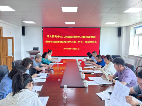 6月11日,理学院在致本楼D座425会议室召开深入贯彻中央八项规定精神学习教育读书班暨党委理论学习中心组(扩大)专题学习会。理学院党委书记徐平主持会议,理学院党委委员、党支部书记参加会议,副校长王国刚列席指导。