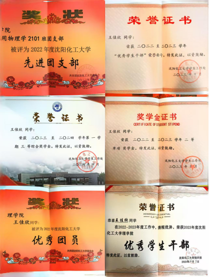 王佳欣,女,满族,中共预备党员,理学院应用物理2021级本科生,现任应物2101班团支书,曾任学院学生会主席团成员。曾获得沈阳化工大学学业奖学金多次,2024年辽宁省大学生物理竞赛省三等奖,校级“优秀学生干部”“优秀团员”荣誉称号。