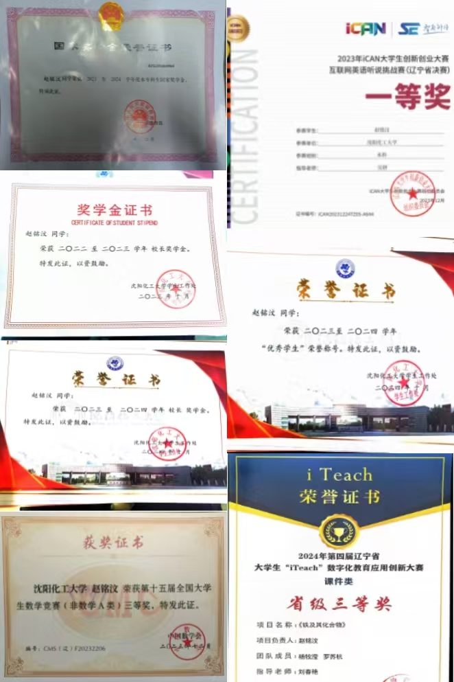 在学习上,赵铭汶秉持“书山有路勤为径,学海无涯苦作舟” 的进取精神,脚踏实地、不断奋进。他善于规划时间,持续充实知识储备,提升专业素养,至今,已连续两学年取得专业第一的优异成绩,不仅获得了国家级奖学金与校长奖学金,还顺利通过英语六级考试,赢得老师和同学们的一致认可。他深知“物有甘苦,尝之者识;道有夷险,履之者知”,因此,除了专注理论知识学习,还踊跃投身各类竞赛,在全国大学生数学竞赛中荣获全国三等奖等多项荣誉 。