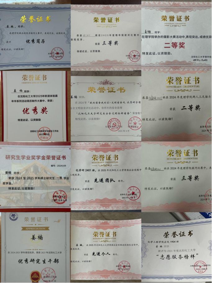 “你的梦想有多远,你就会走多远”。作为一名中共党员,姜楠始终牢记党员身份,时刻以先进性标准严格要求自己,把党性修养融入日常学习、工作与生活的方方面面。她坚定理想信念,自觉拥护党的领导,践行社会主义核心价值观,始终保持求真务实、严于律己的作风,在思想上、行动上始终与党组织保持高度一致,以榜样力量带动身边同学,充分发挥党员的先锋模范作用,曾参加沈阳化工大学第一届妇女代表大会。同时,她重视班级的思想教育引导工作,组织开展特色团支部活动近30次,将理论知识变得生动形象,让同学们更好地汲取前进的力量,铭记青年担当。并带领班级先后获得沈阳化工大学先进班集体、沈阳化工大学2025秋季研究生主题班会一等奖等众多奖项。